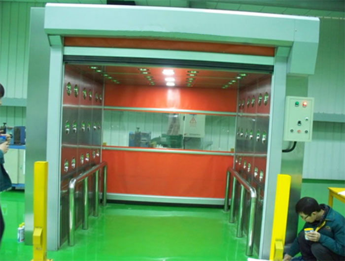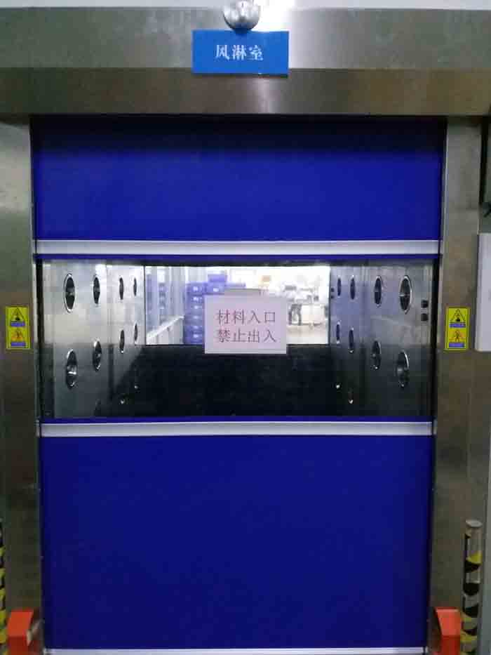 快速卷帘门风淋室或者卷帘门货淋室,快速卷帘门风淋室与卷帘门货淋室是一种通用性较强的局部净化设备,安装于洁净区与非洁净区之间,当人员、货物需进入洁净区时必须经过该装置,空气经高效过滤器过滤后由可旋转喷嘴从各个方向喷射至人身及货物上,能够有效而迅速清除人身及携带物品表面的尘埃粒子,阻断尘埃进入洁净区。